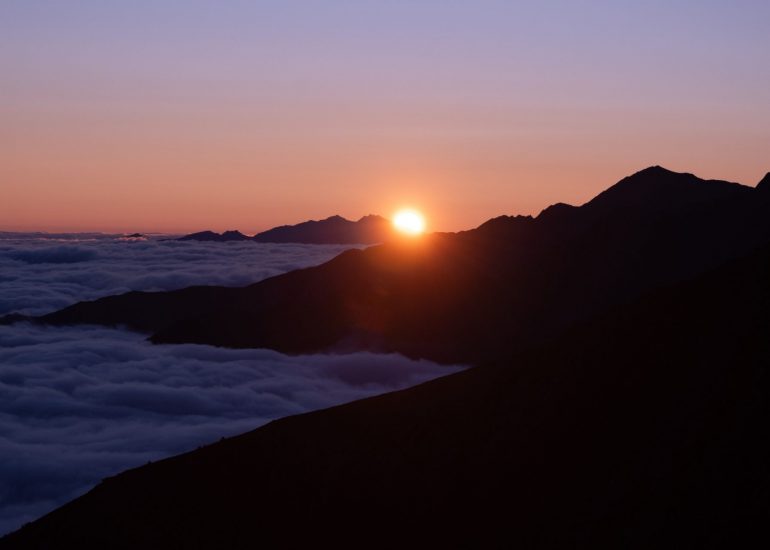 À l’aube, les premiers rayons du soleil percent doucement l’obscurité, illuminant une mer de nuages qui s’étend à perte de vue sous les sommets. Les teintes rosées et dorées se mêlent, créant une atmosphère presque irréelle.